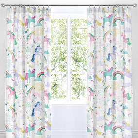 * 1 x Pair of Curtains * Rainbow Unicorn Design * Made from Polycotton * Pencil Pleat Header Add a touch of magic and fantasy with this delightful design, scattered with radiant rainbows and enchanting unicorns. These pretty, vibrant and charming curtains are a fantastic way to update your child’s bedroom décor, making bedtime a…